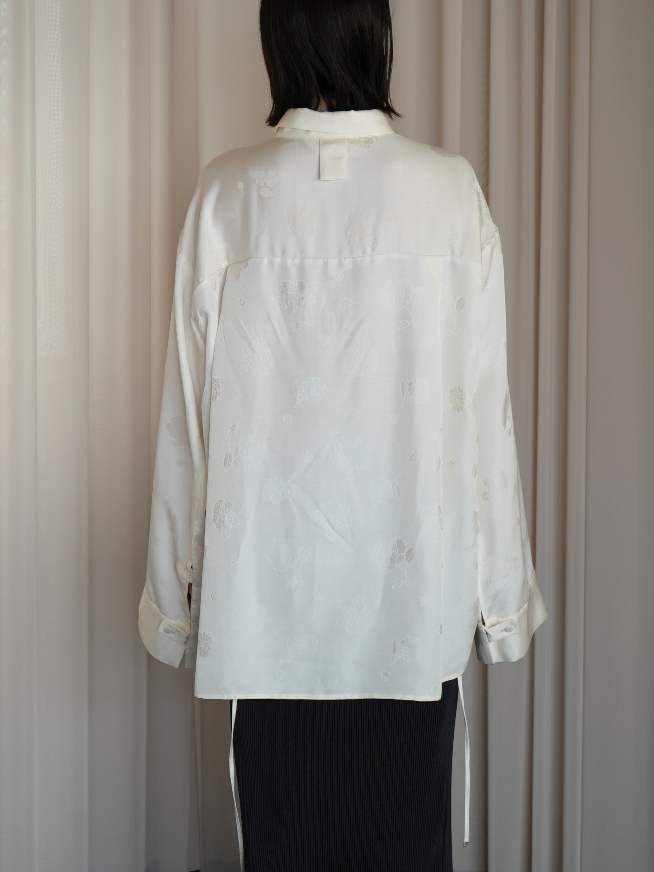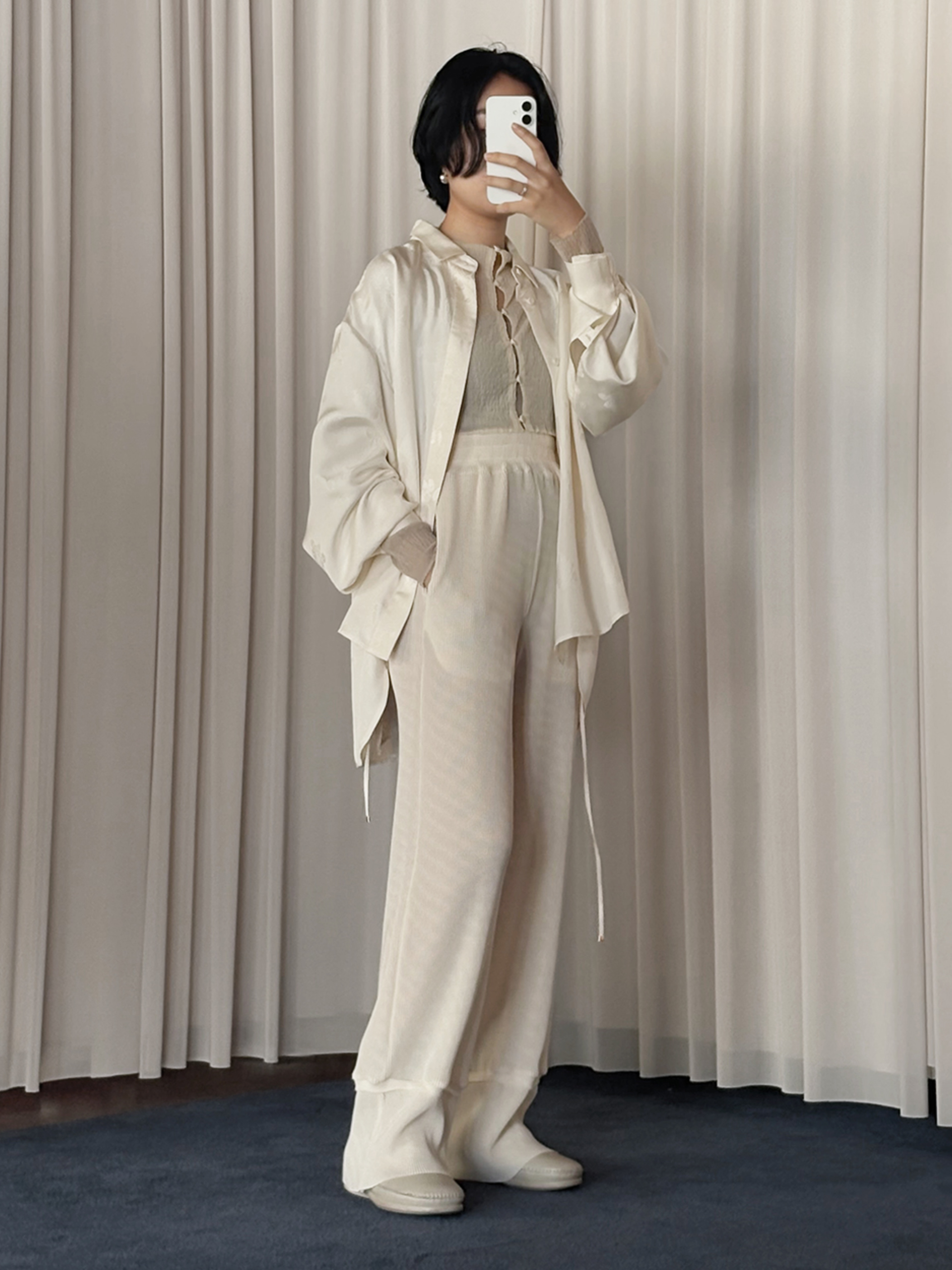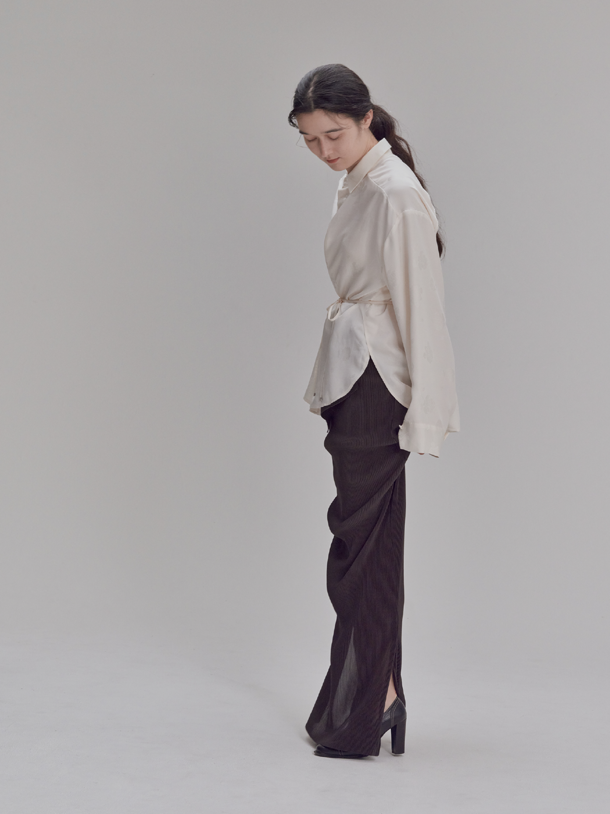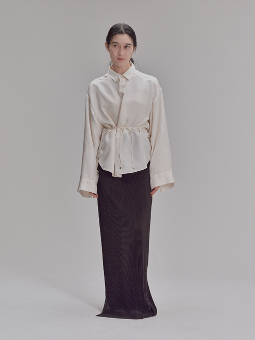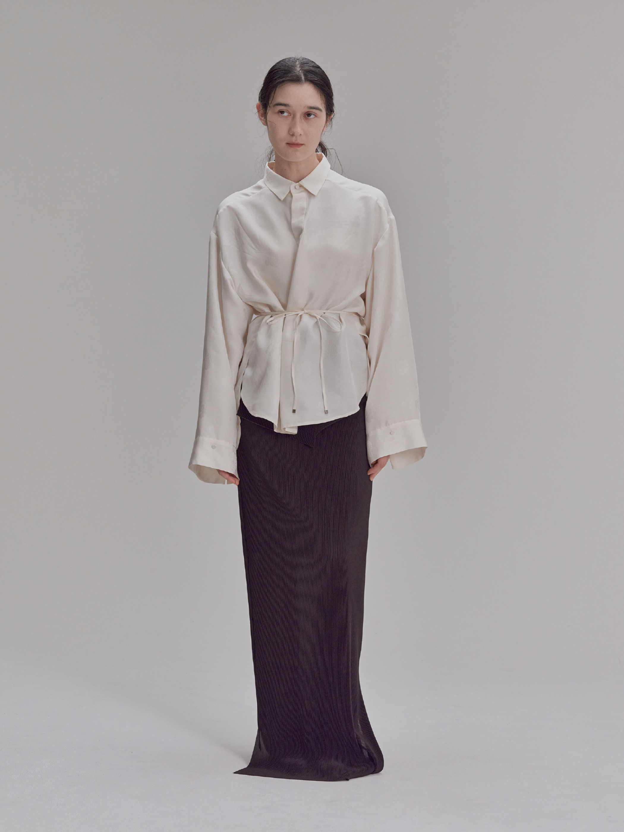 ボウタイ兼付属紐を前後で結ぶ事で、シルエットの変化やアレンジが楽しめる。