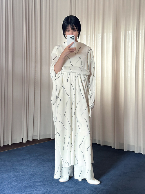 全て前後両面で着用可能。今季は定番のプルオーバー・ドレス・スカート・パンツに加え、スカーフのように生地を結んでスタイリングできる3型を展開。