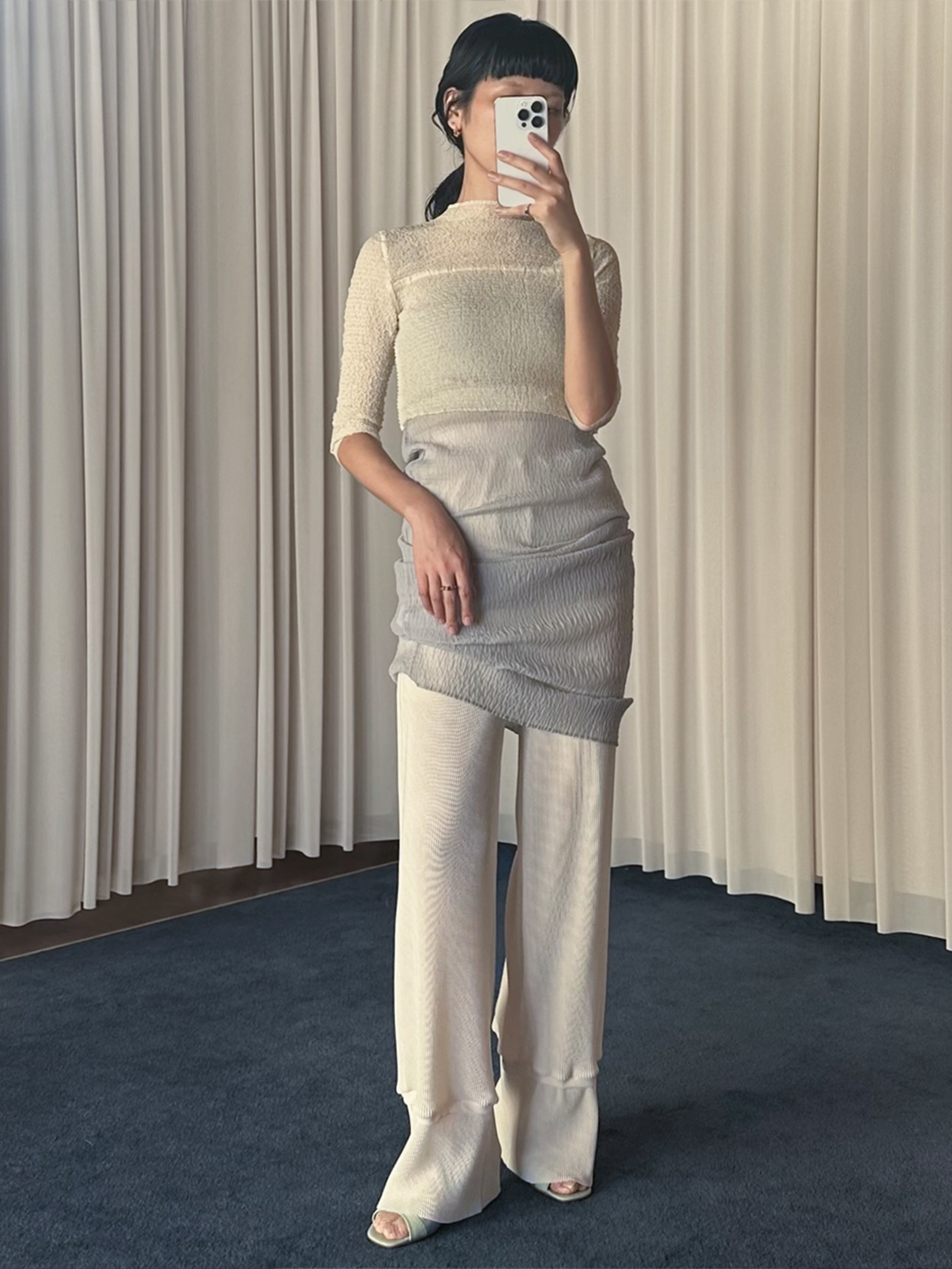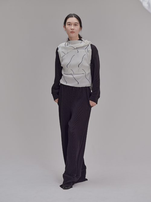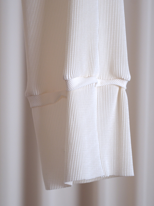 一見サーマルのように見えるこの素材は、ハニカム構造のニット素材にクリスタルプリーツを施したもの。