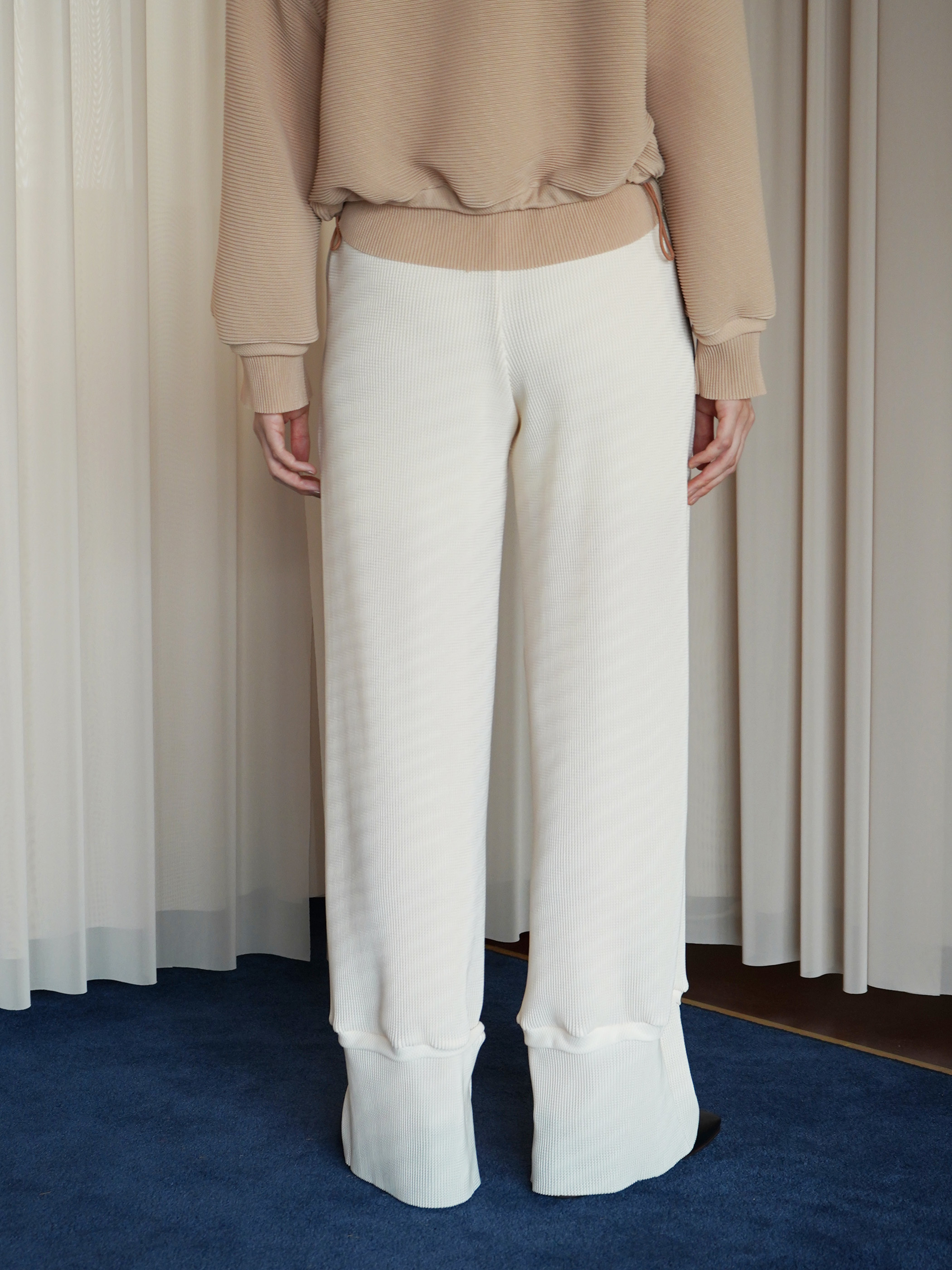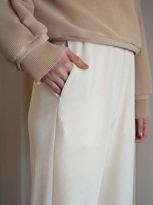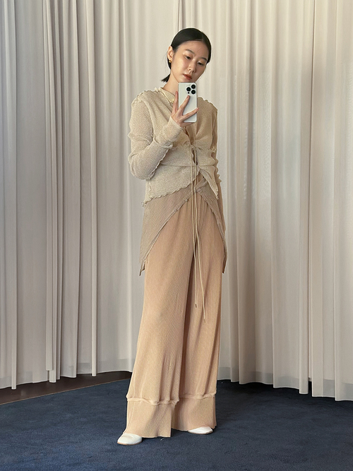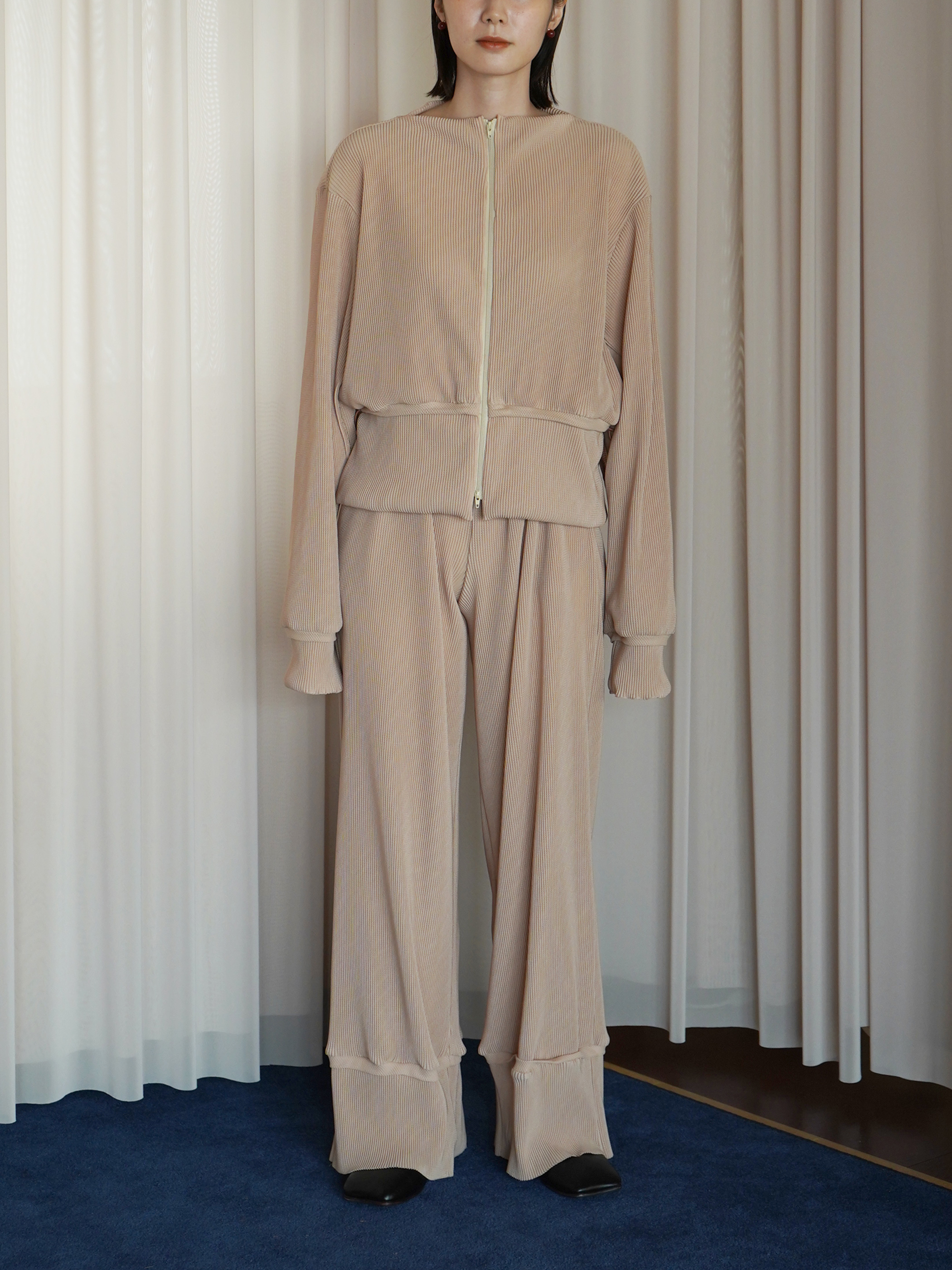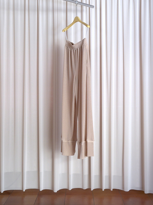 生地は非常に肌触りが良く、柔らかさと膨らみ、軽さを兼ね備えている。デザインは部屋着のようなリラックス感のあるシルエットに落とし込みメンズ展開を行う。ウエスト等に組み込んだスピンドルを調整してスタイリングのアレンジも可能。別注による繊細なカラー展開を行っており、異なる色を組み合わせたセットアップスタイルもおすすめ。