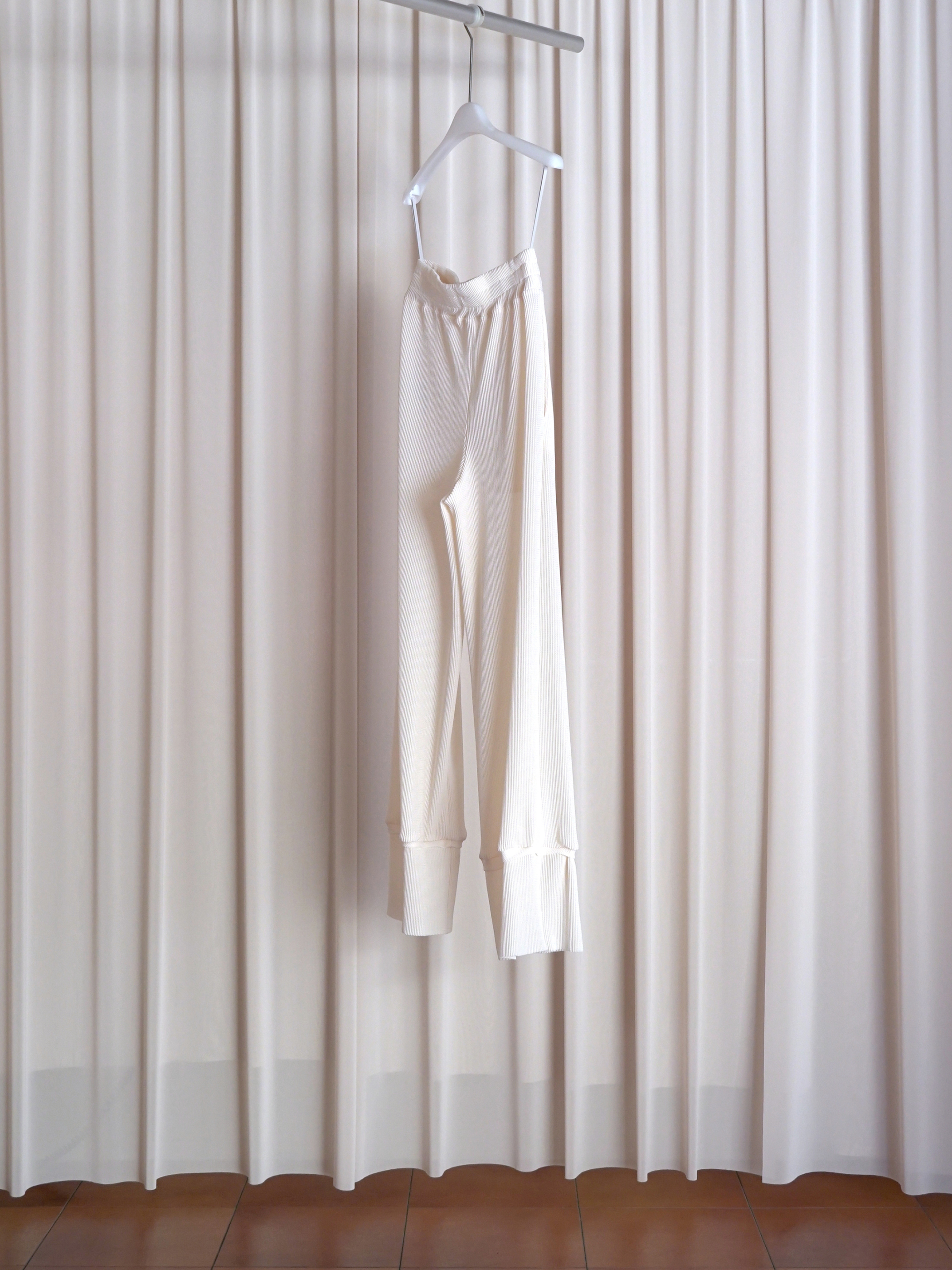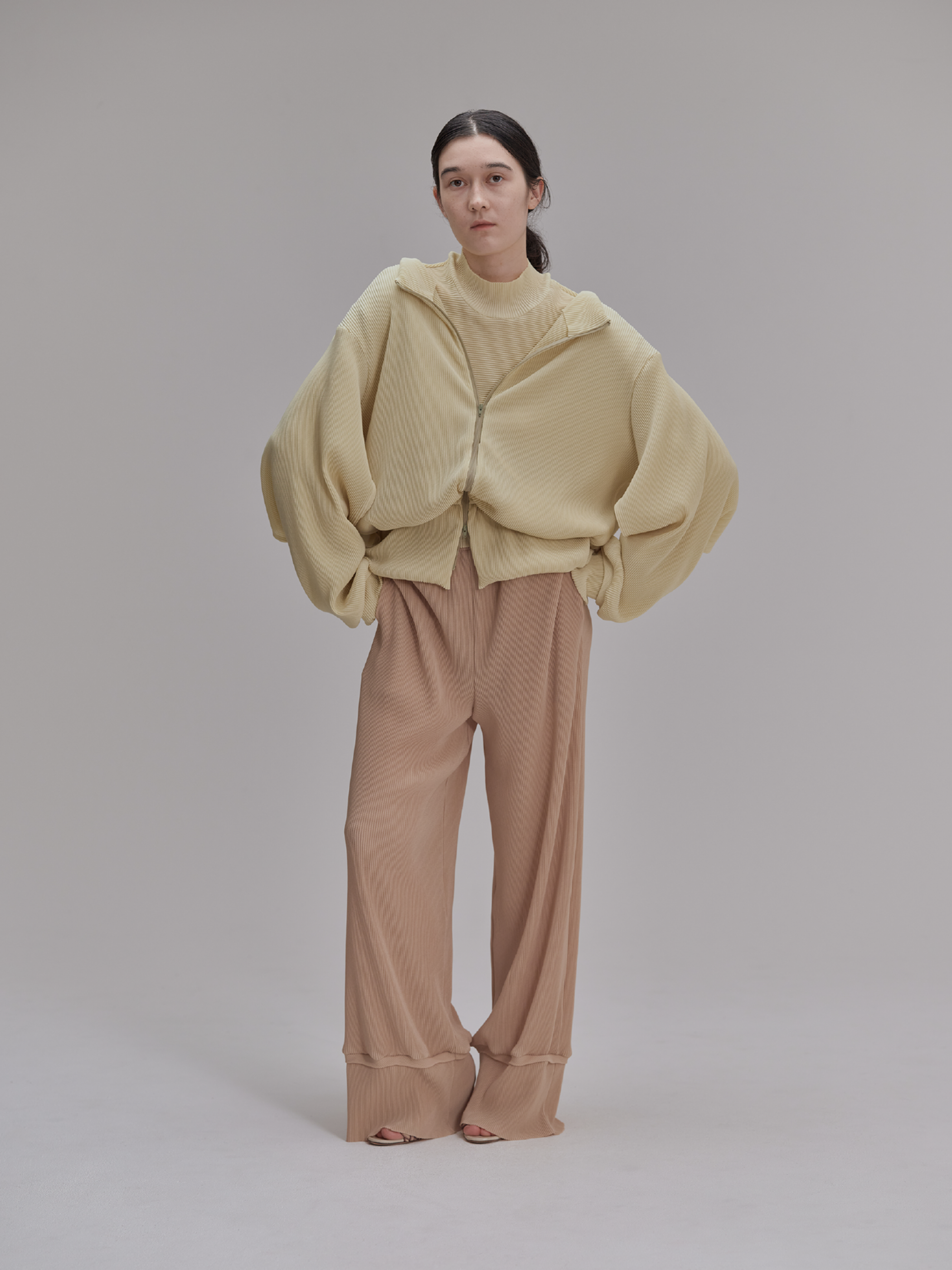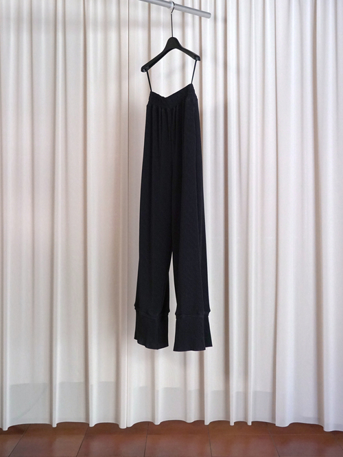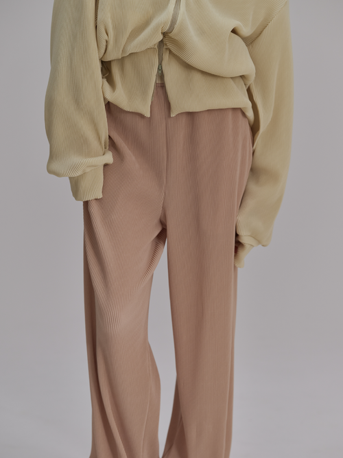生地は非常に肌触りが良く、柔らかさと膨らみ、軽さを兼ね備えている。デザインは部屋着のようなリラックス感のあるシルエットに落とし込みメンズ展開を行う。ウエスト等に組み込んだスピンドルを調整してスタイリングのアレンジも可能。別注による繊細なカラー展開を行っており、異なる色を組み合わせたセットアップスタイルもおすすめ。