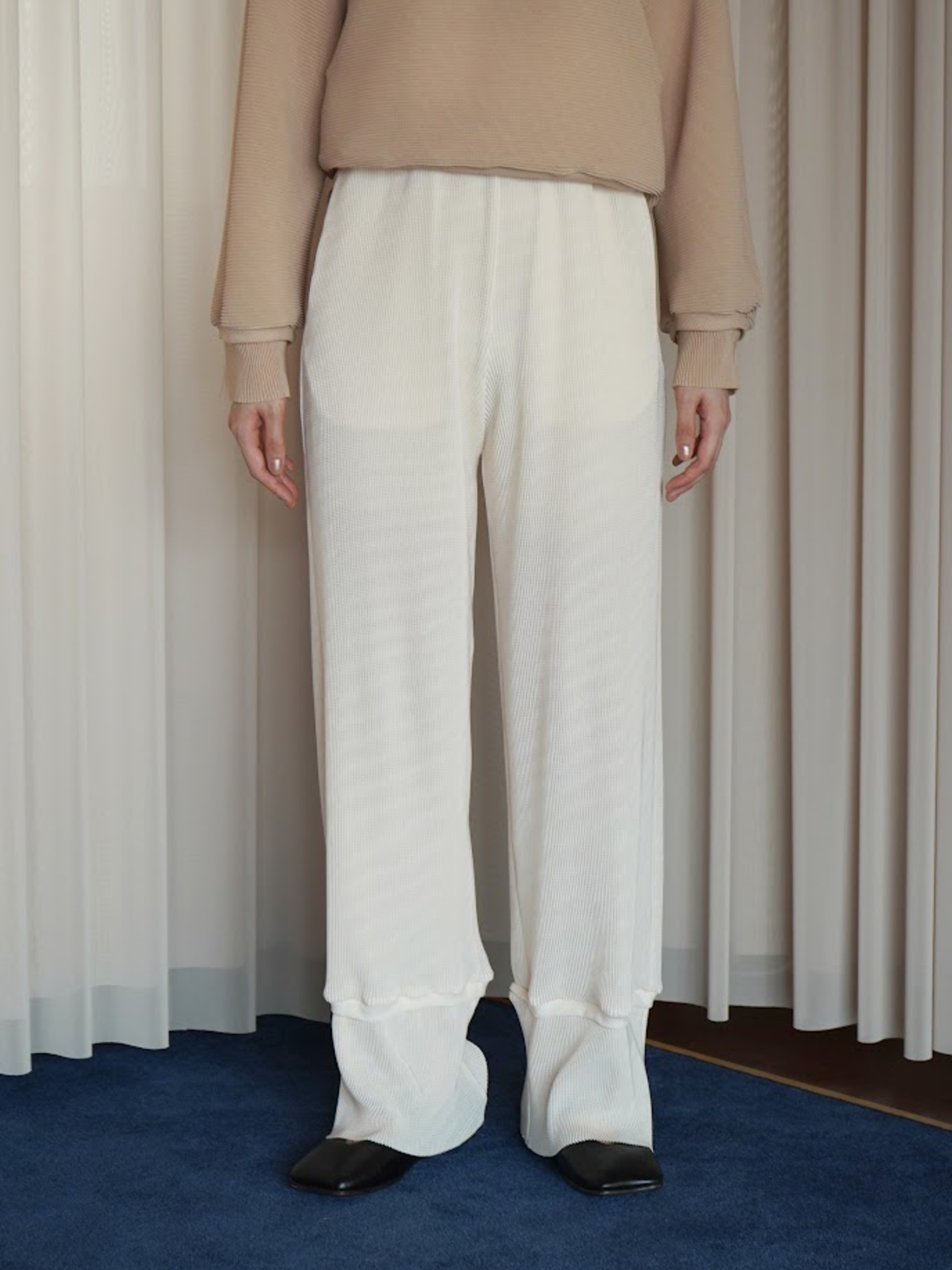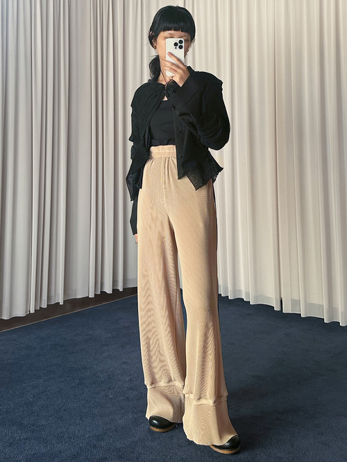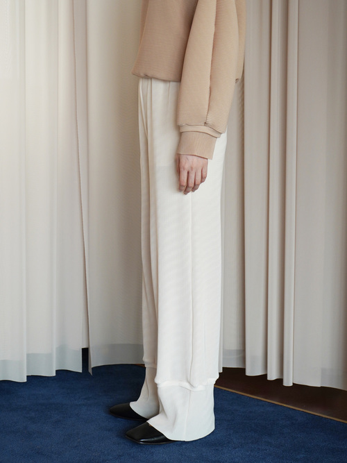 裾のデザインが特徴的なワイドパンツ。