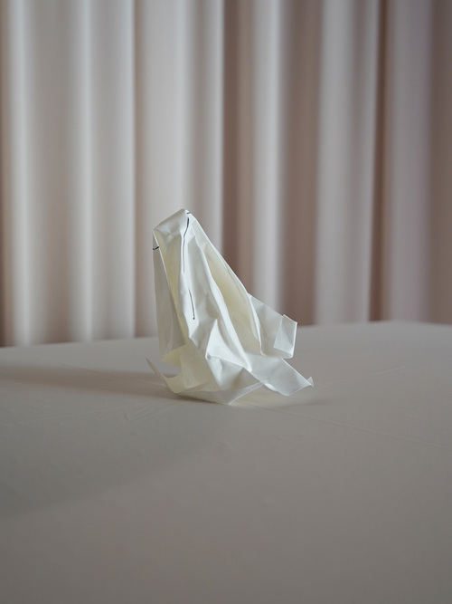 抜け殻のような立体感を持つ硬質な紙に、線が描かれた作品。