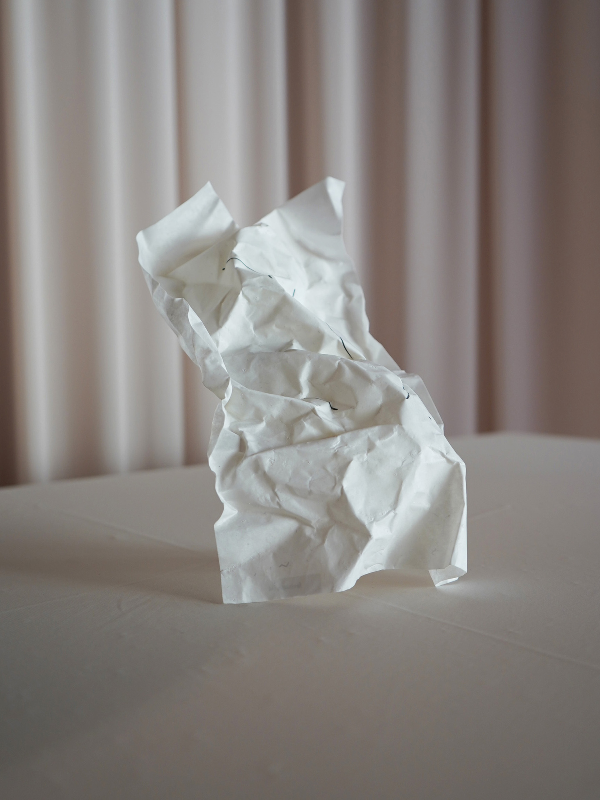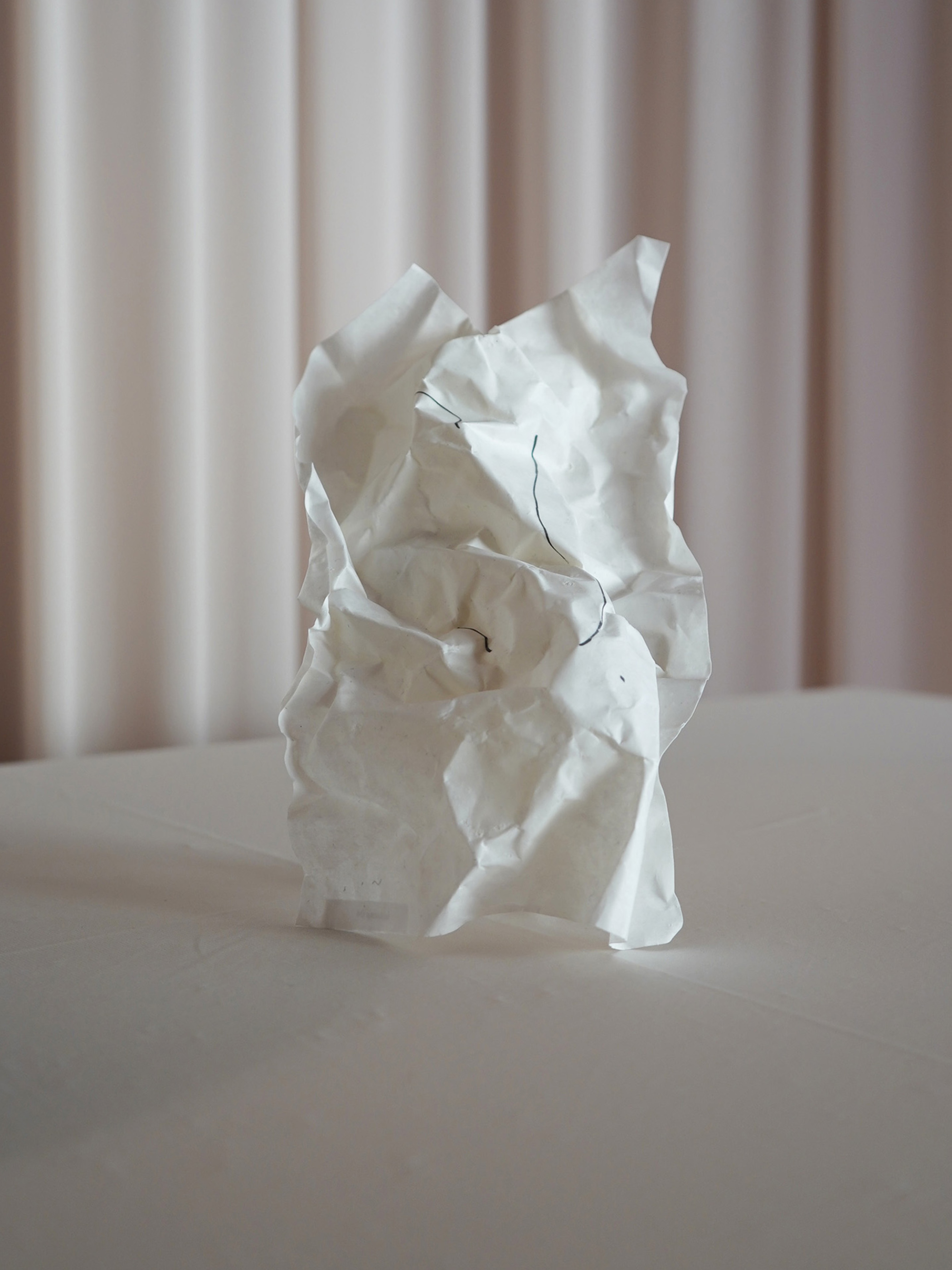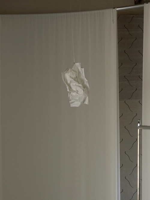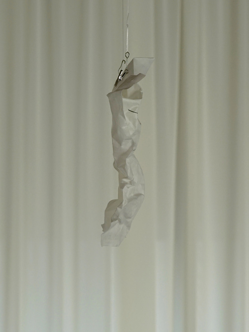 抜け殻のような立体感を持つ硬質な紙に、線が描かれた作品。ゴーストが今世で新たな身体を得て、密かにうごめいているかのよう。