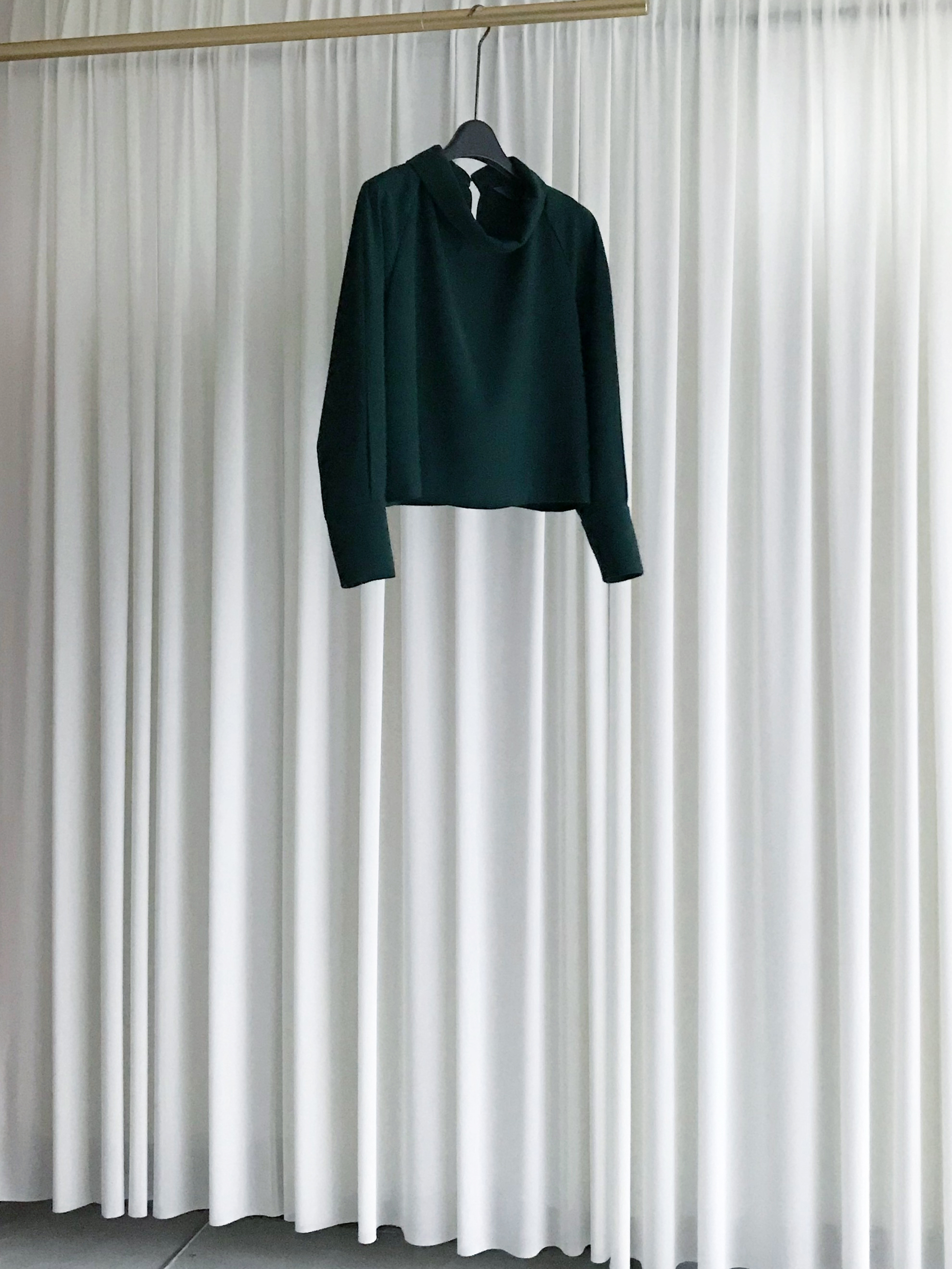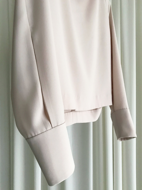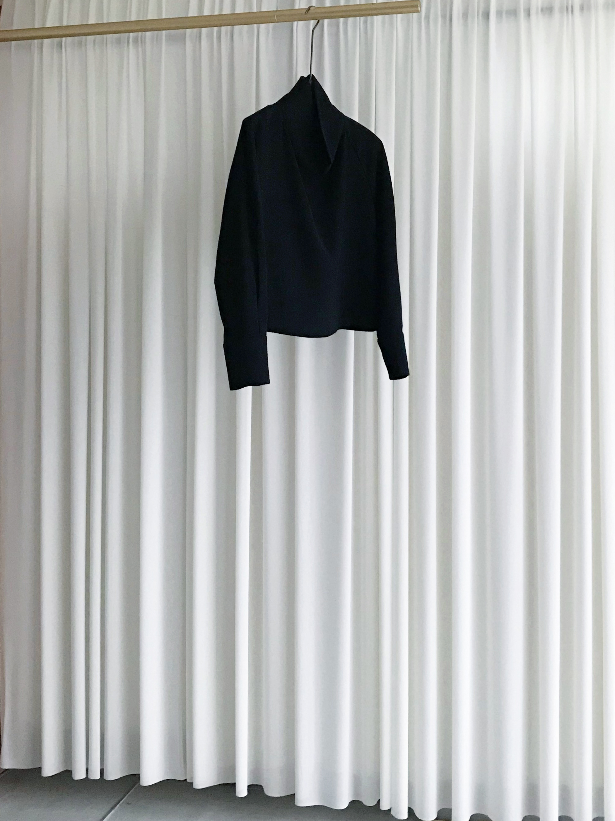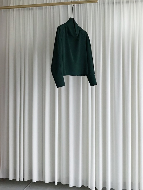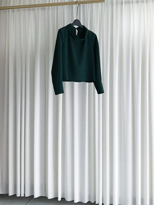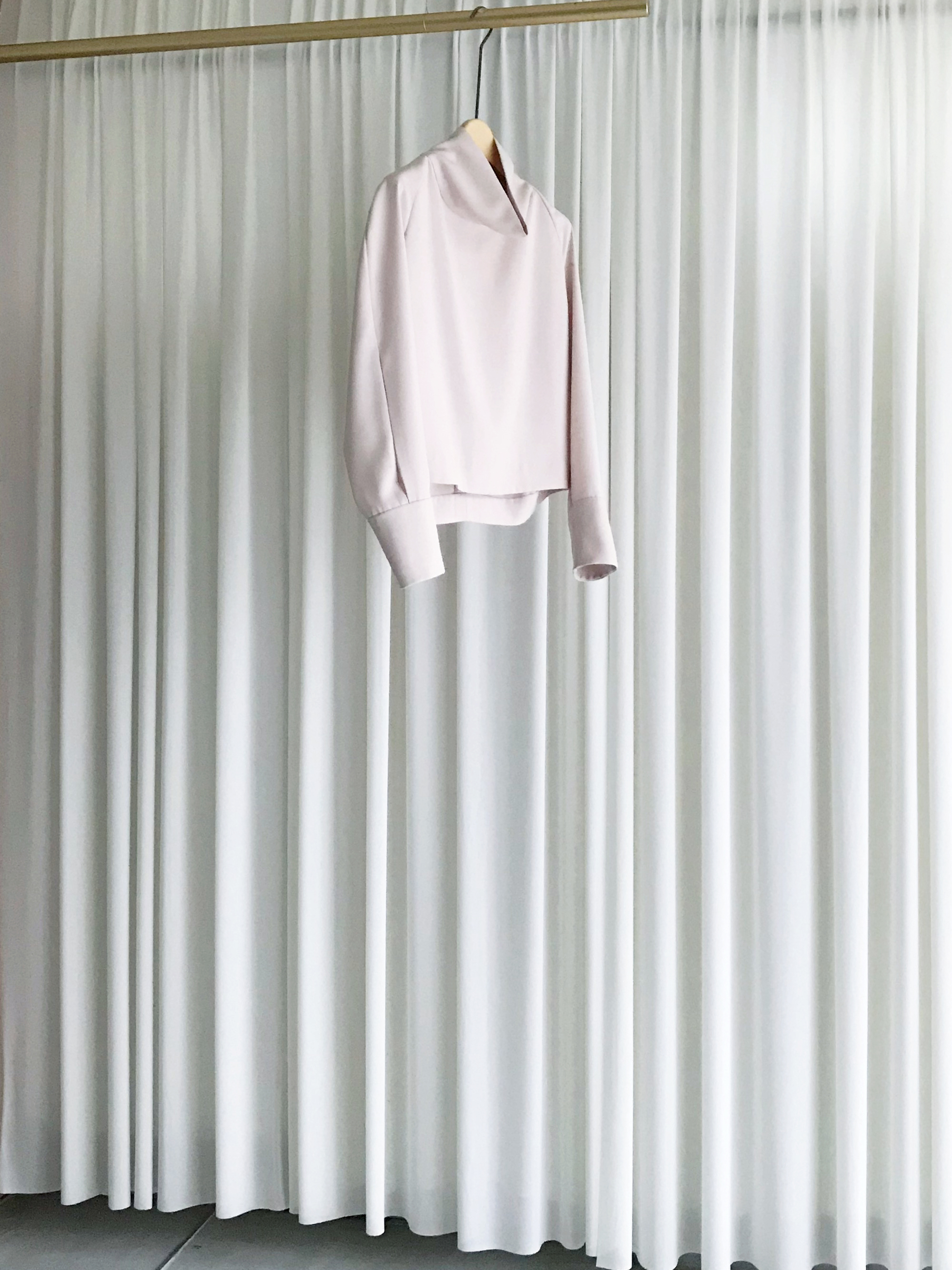 ハイネックブラウスは首に沿うジャケットのラインへの相性を考えてデザイン。