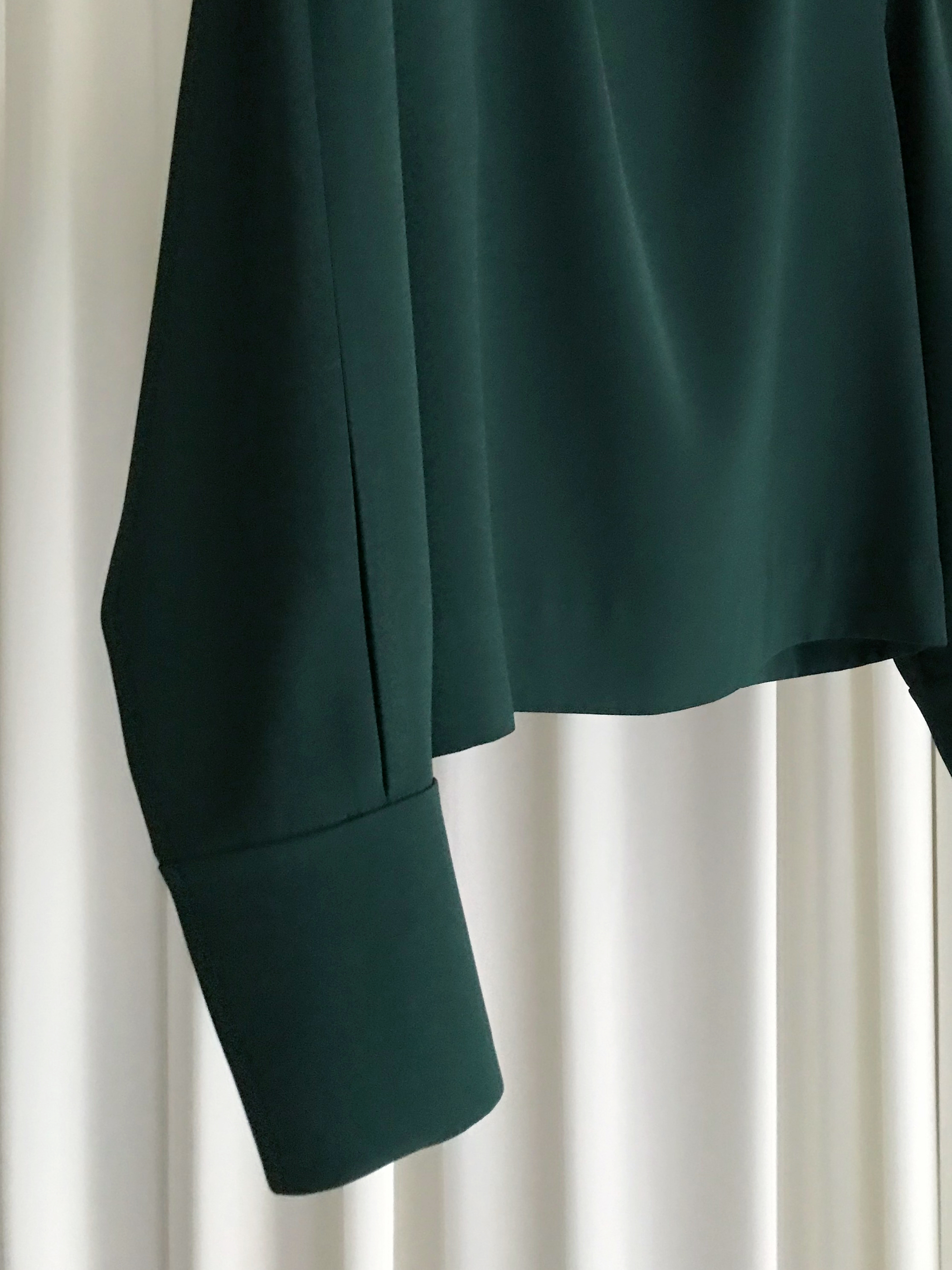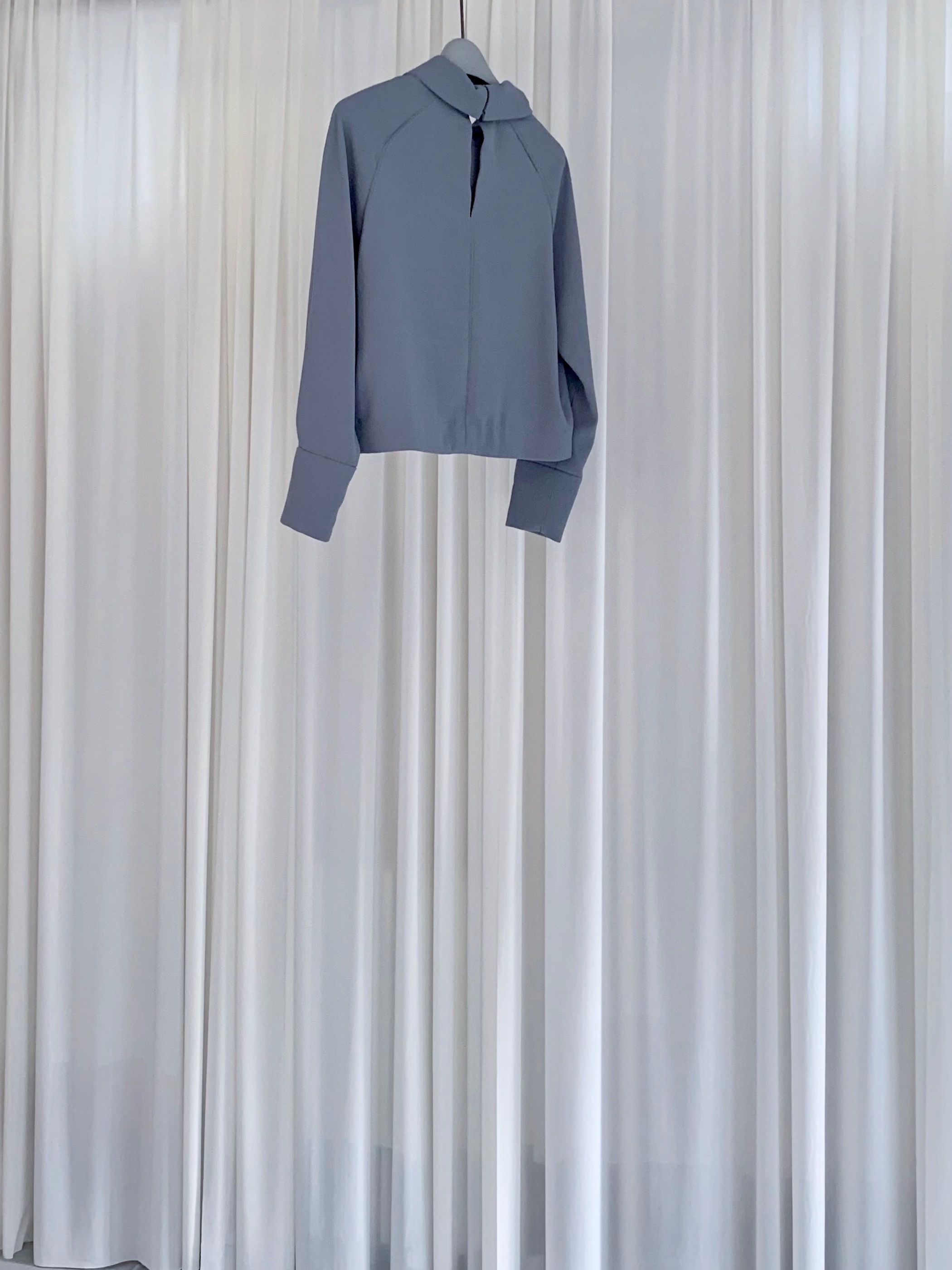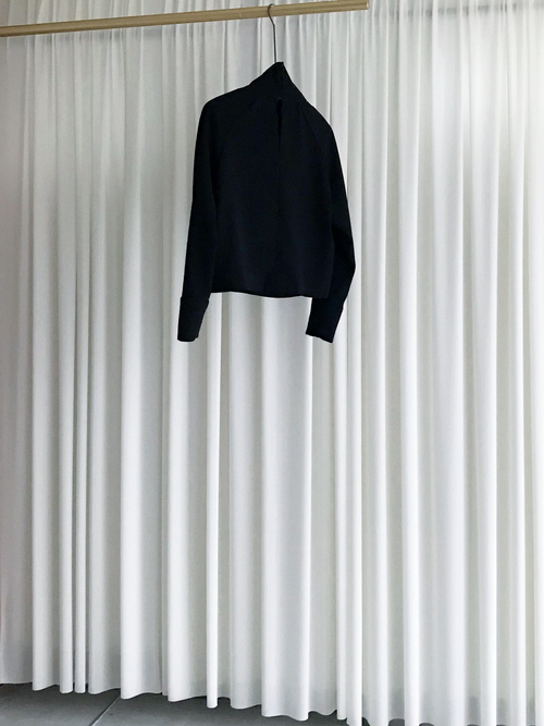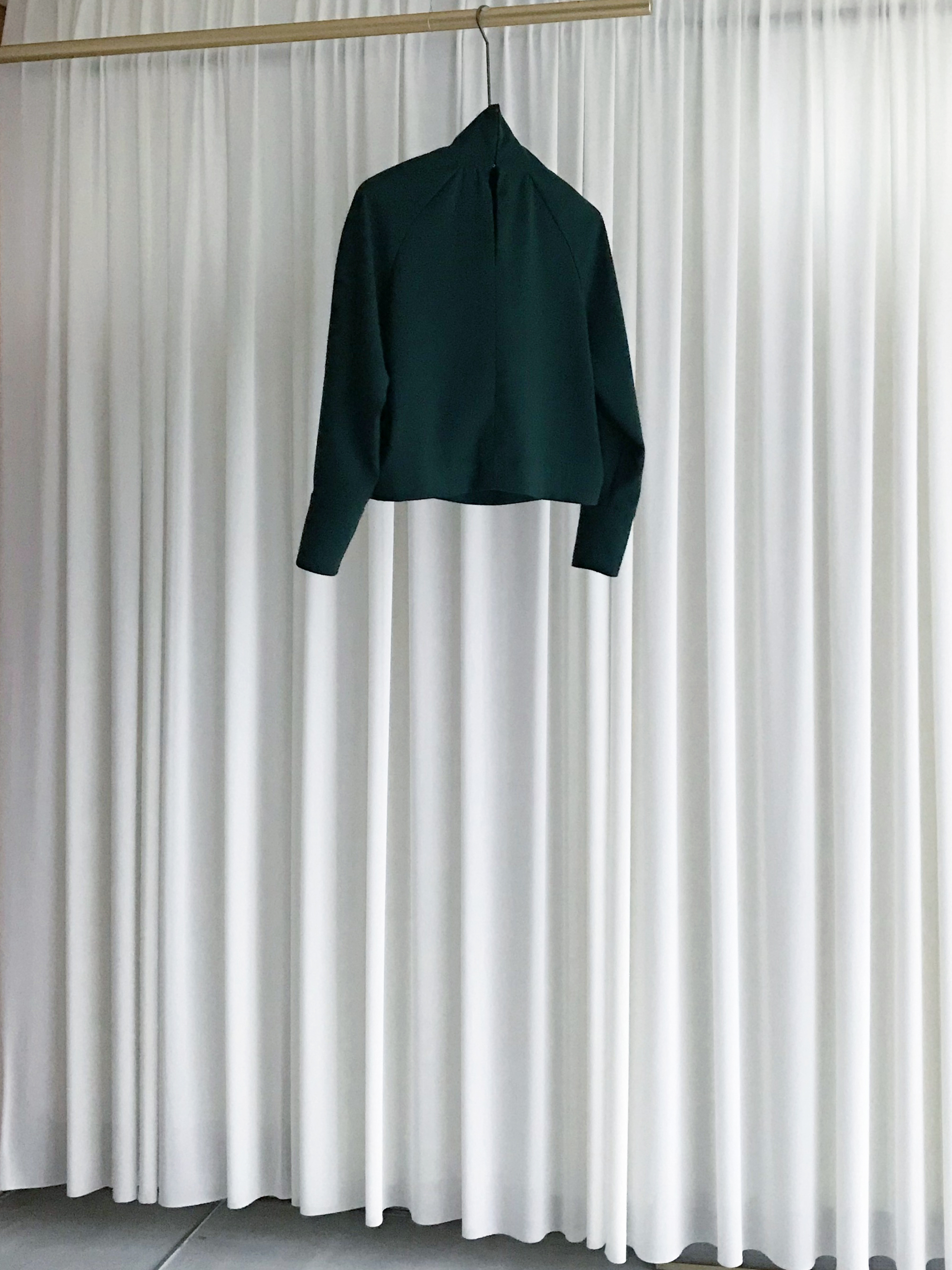 ハイネックブラウスは首に沿うジャケットのラインへの相性を考えてデザイン。