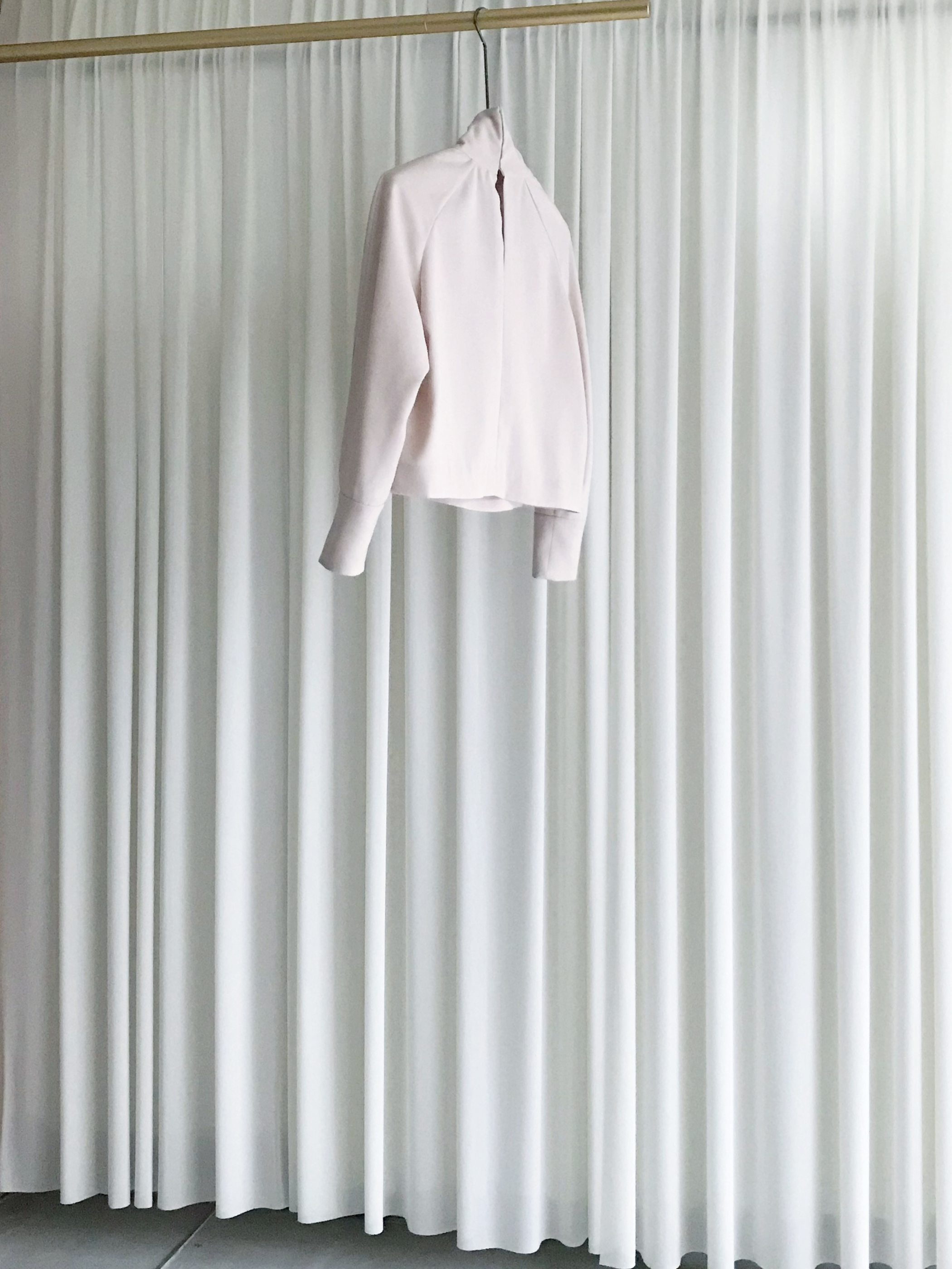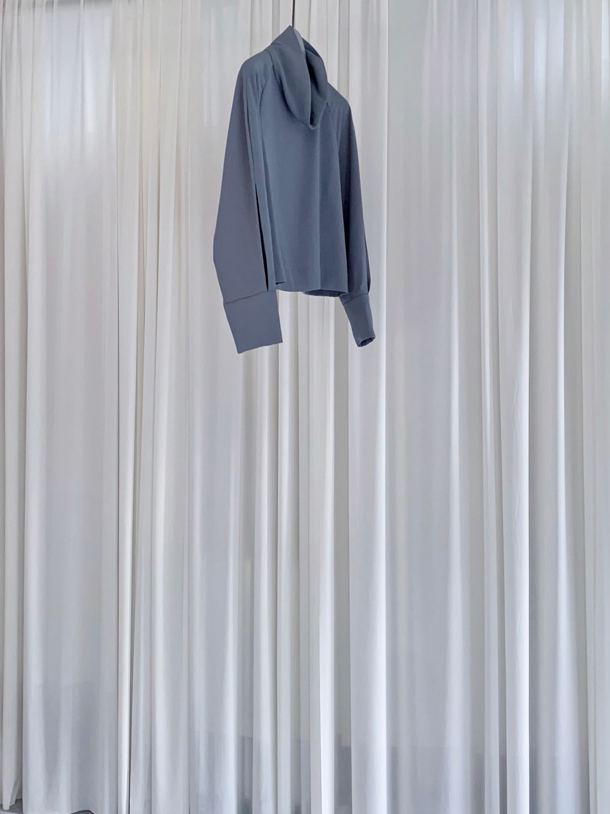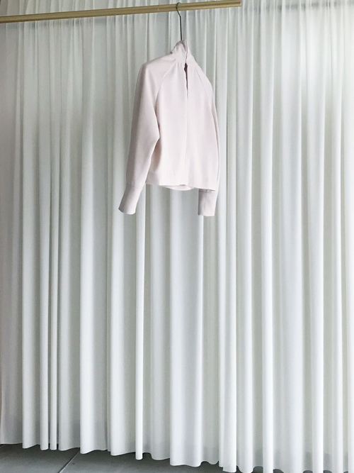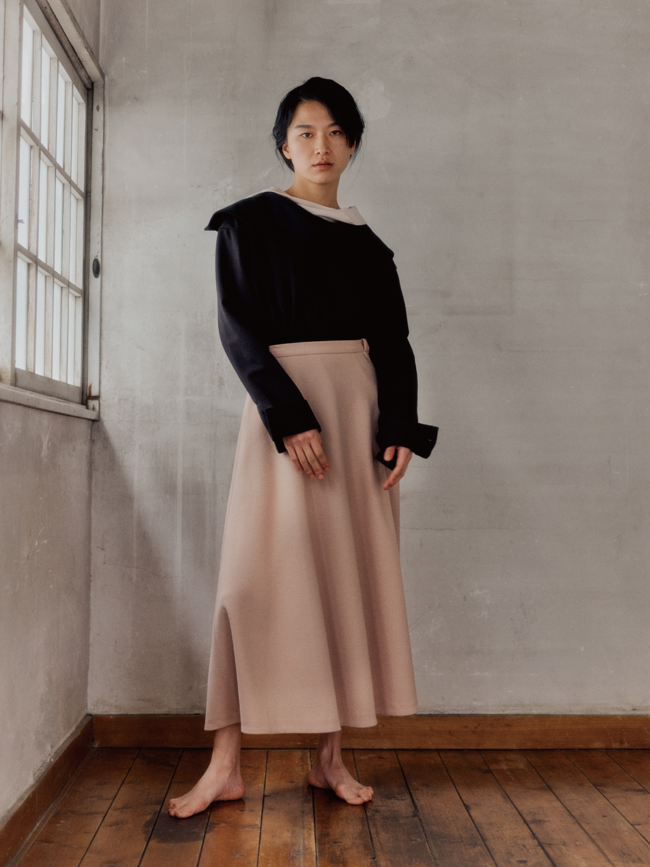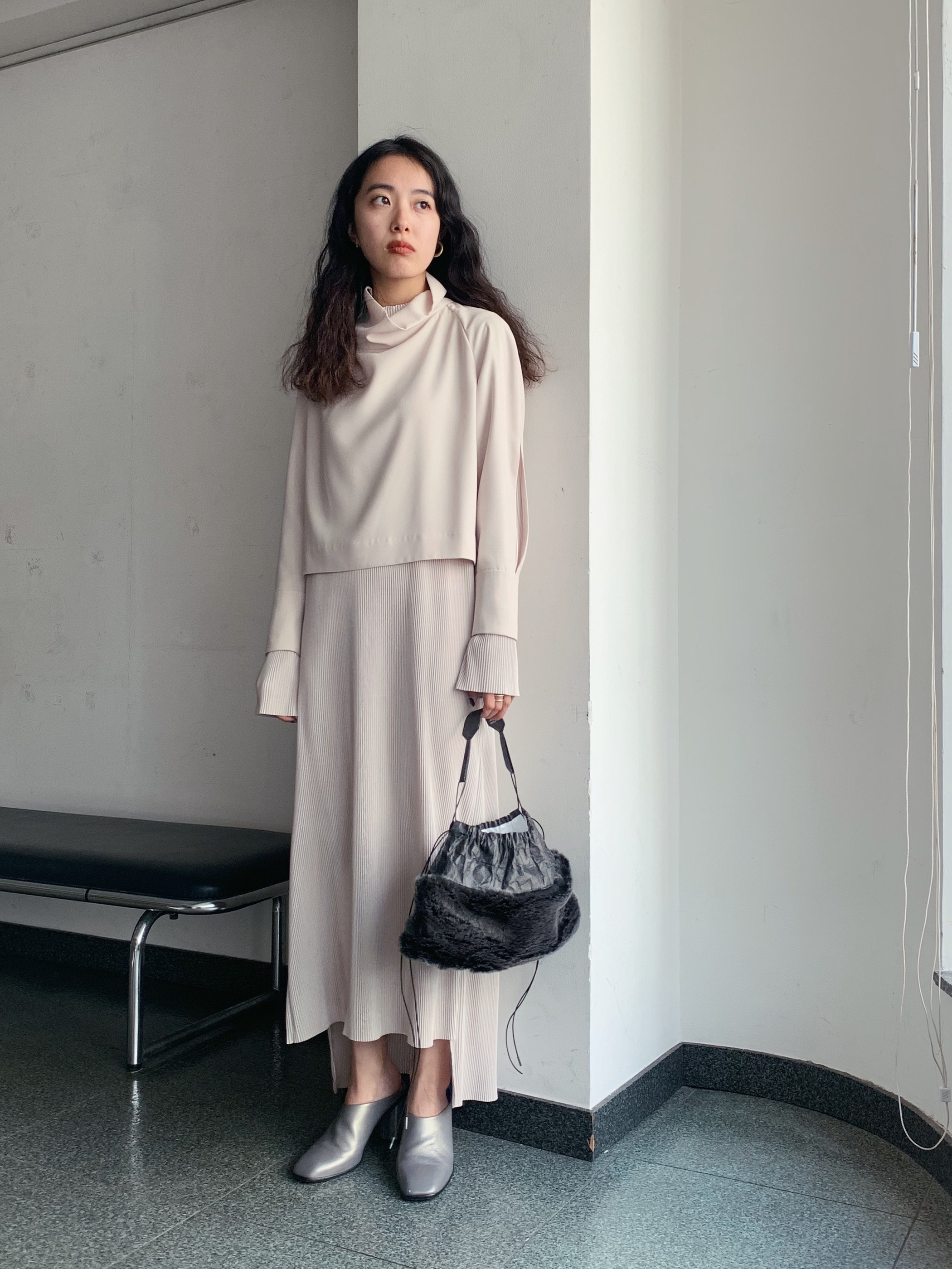 ハイネックブラウスは首に沿うジャケットのラインへの相性を考えてデザイン。
