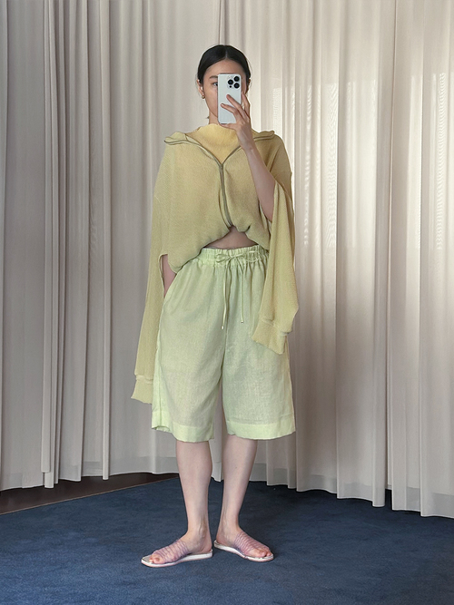 時代を感じさせる独特の質感と、年代ならではの高品質な生地感はヴィンテージならでは。今季はテーマとリンクした指紋のような柄(PINK)やシーズンのキーカラーであるレモン・グレーの5色をピックアップ。中でも花柄の ROSE はシルク100%のスペシャルな素材。メンズ・ウィメンズ共に、シャツとハーフパンツの2型を展開する。