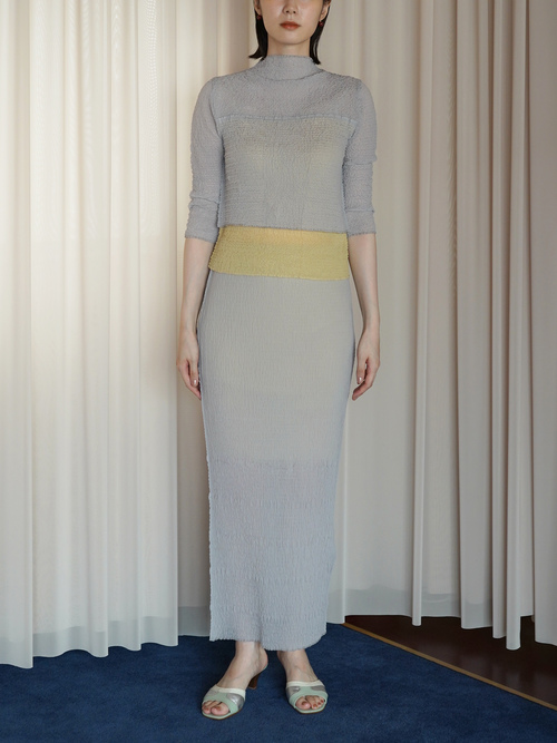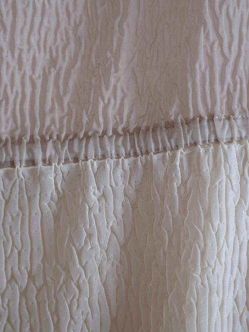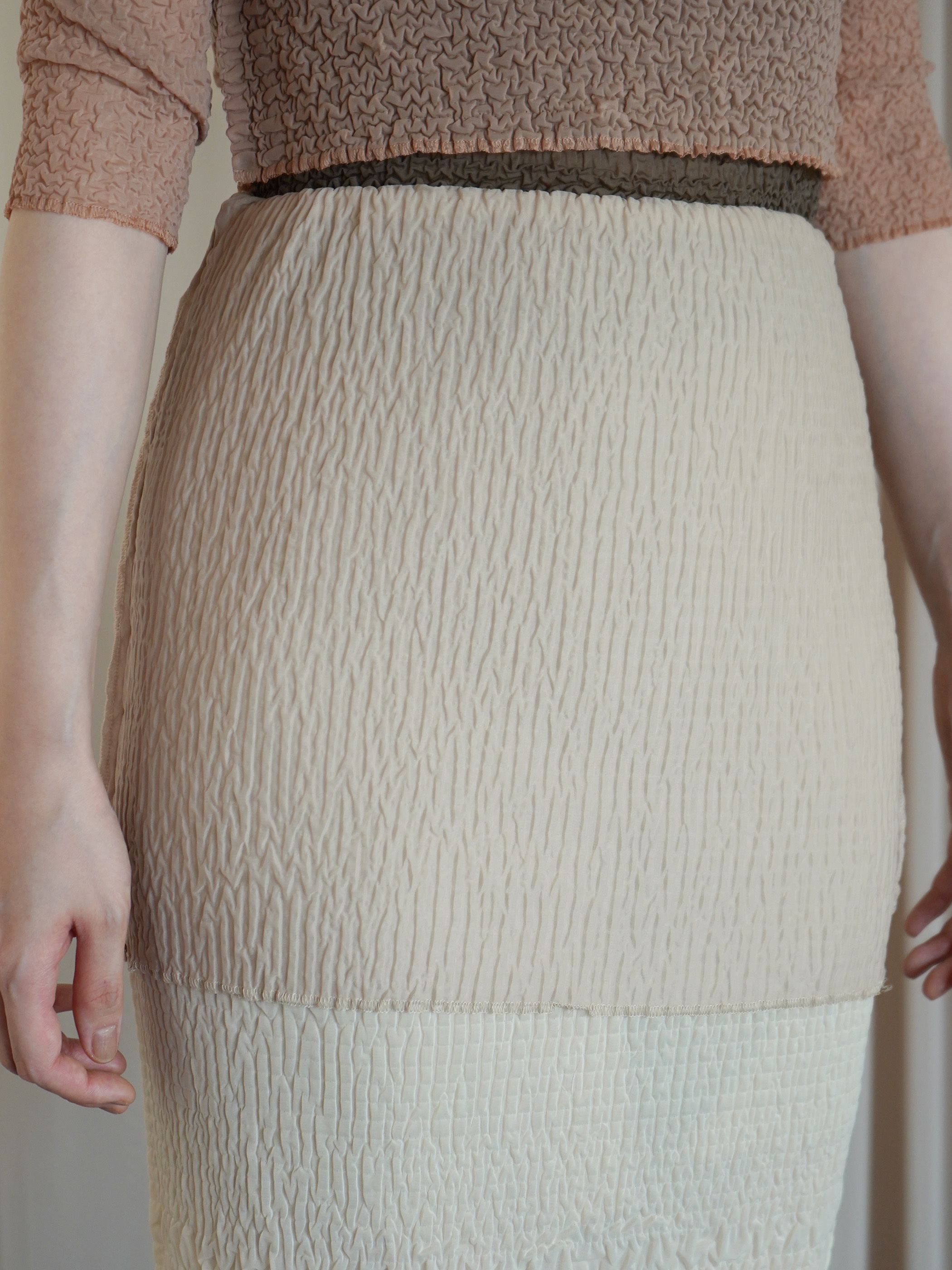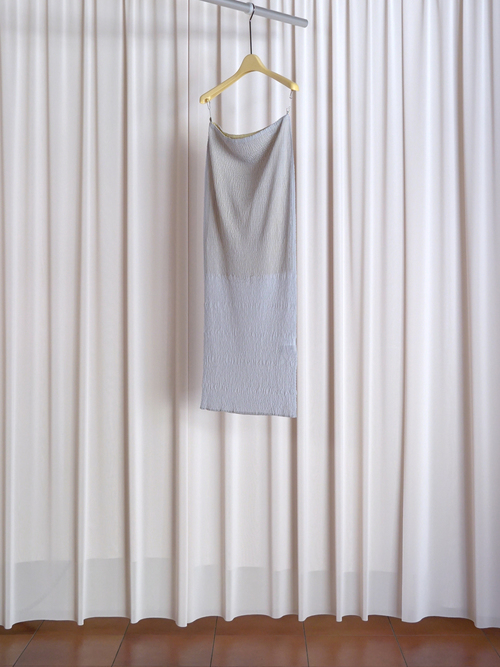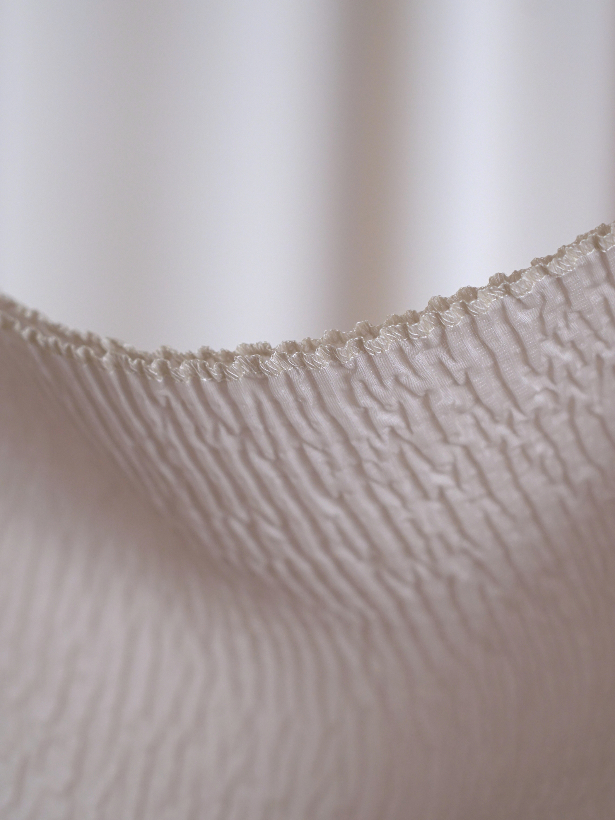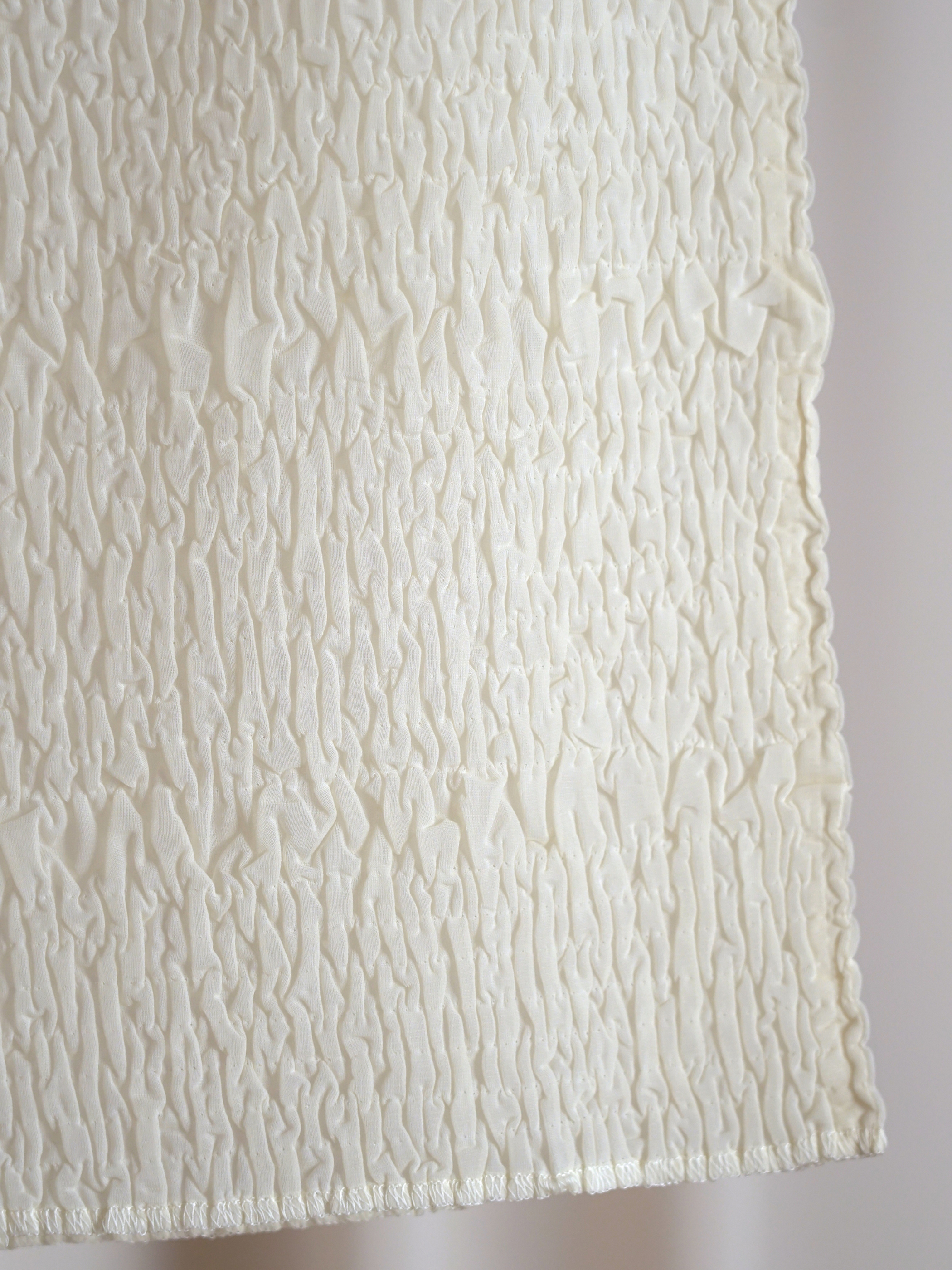 縫い上げた製品にシャーリング刺繍をタテヨコ方向から入れ、熱を加え糸を溶かし生地表面に凹凸を成形している。刺繍の手法ながらも糸を残さない仕上げのため、所謂プリーツでは表現できない独特な素材感に仕上がる。1枚はもちろん、インナーやペチコートの様にも扱える3つのデザインを展開。