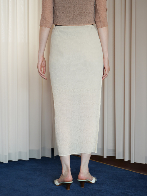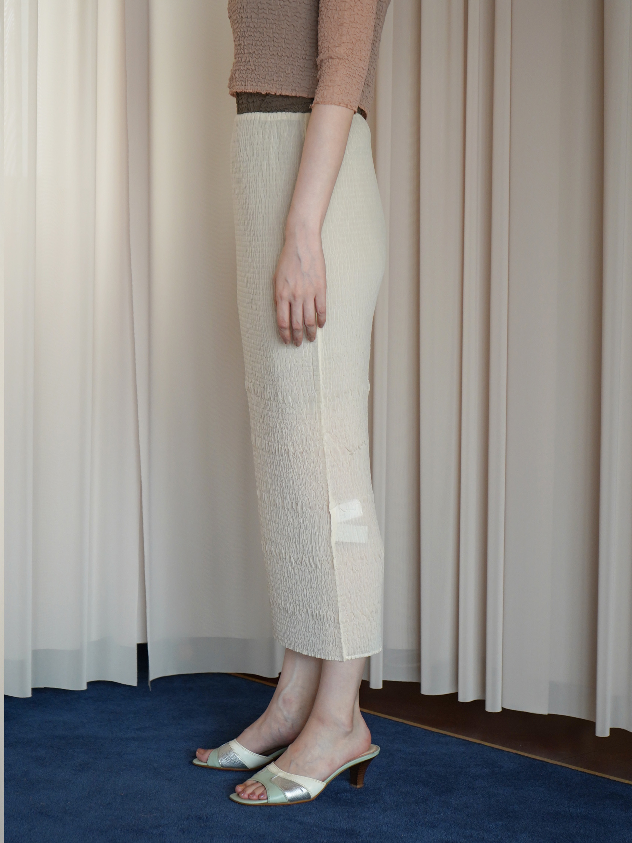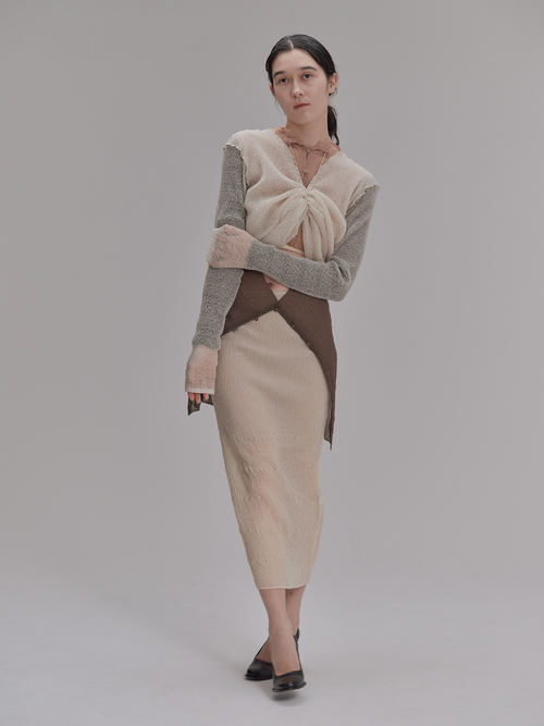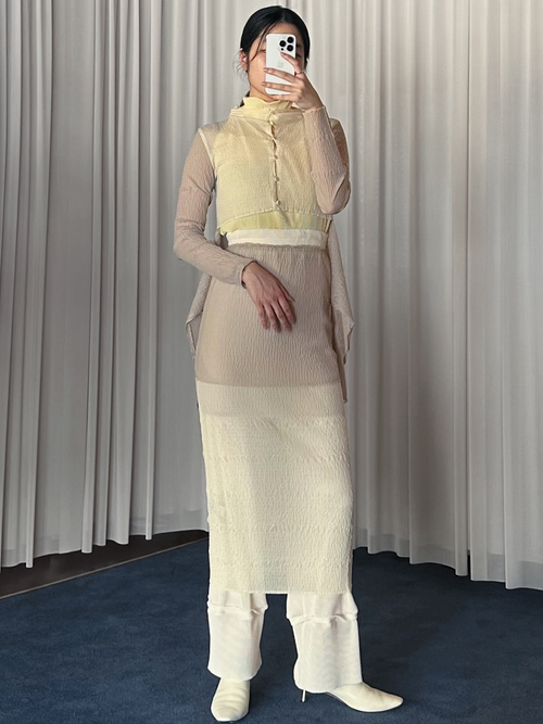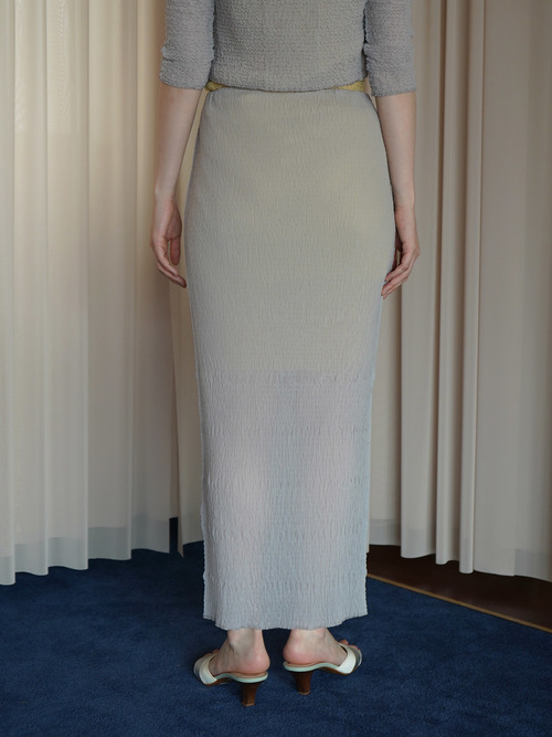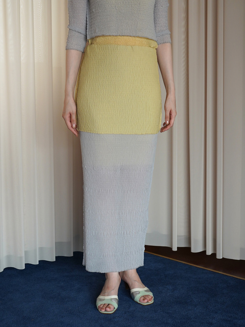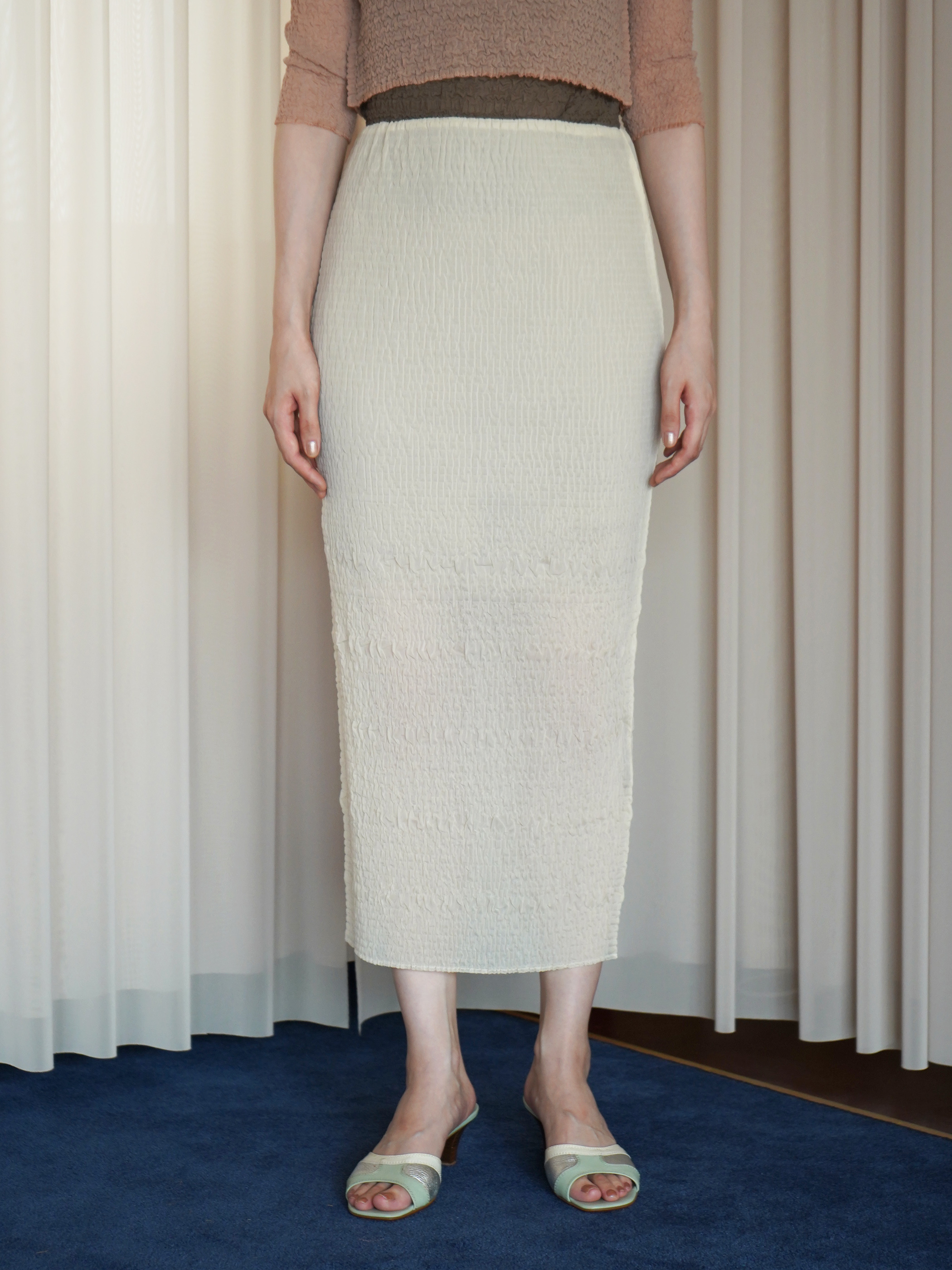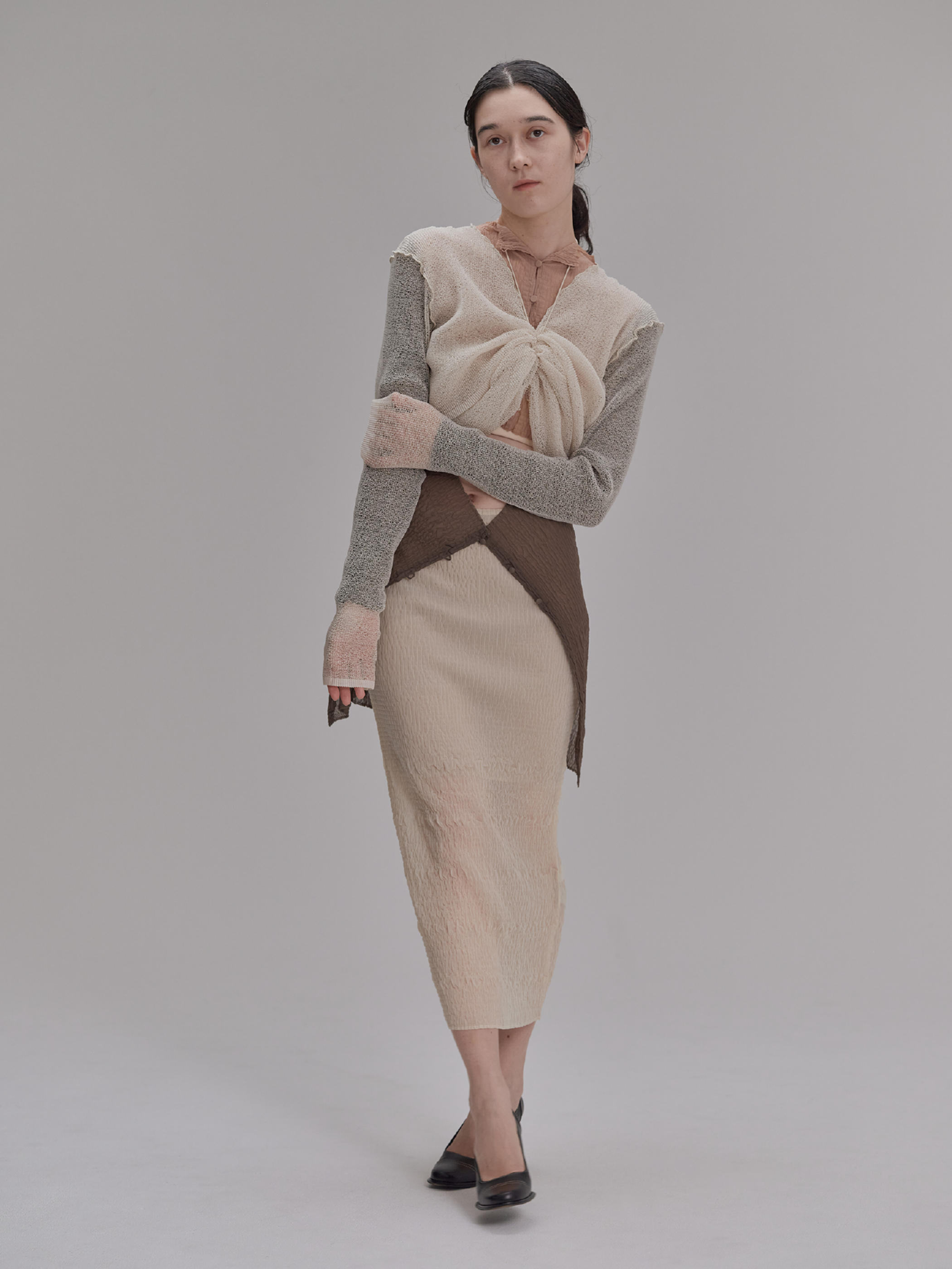縫い上げた製品にシャーリング刺繍をタテヨコ方向から入れ、熱を加え糸を溶かし生地表面に凹凸を成形している。刺繍の手法ながらも糸を残さない仕上げのため、所謂プリーツでは表現できない独特な素材感に仕上がる。1枚はもちろん、インナーやペチコートの様にも扱える3つのデザインを展開。
